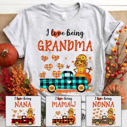 I Love Being A Nana Straw Man Pumpkin Truck Shirt, Grandma Nana Halloween Shirt, Custom Grandma With Grandkids Name Shirt