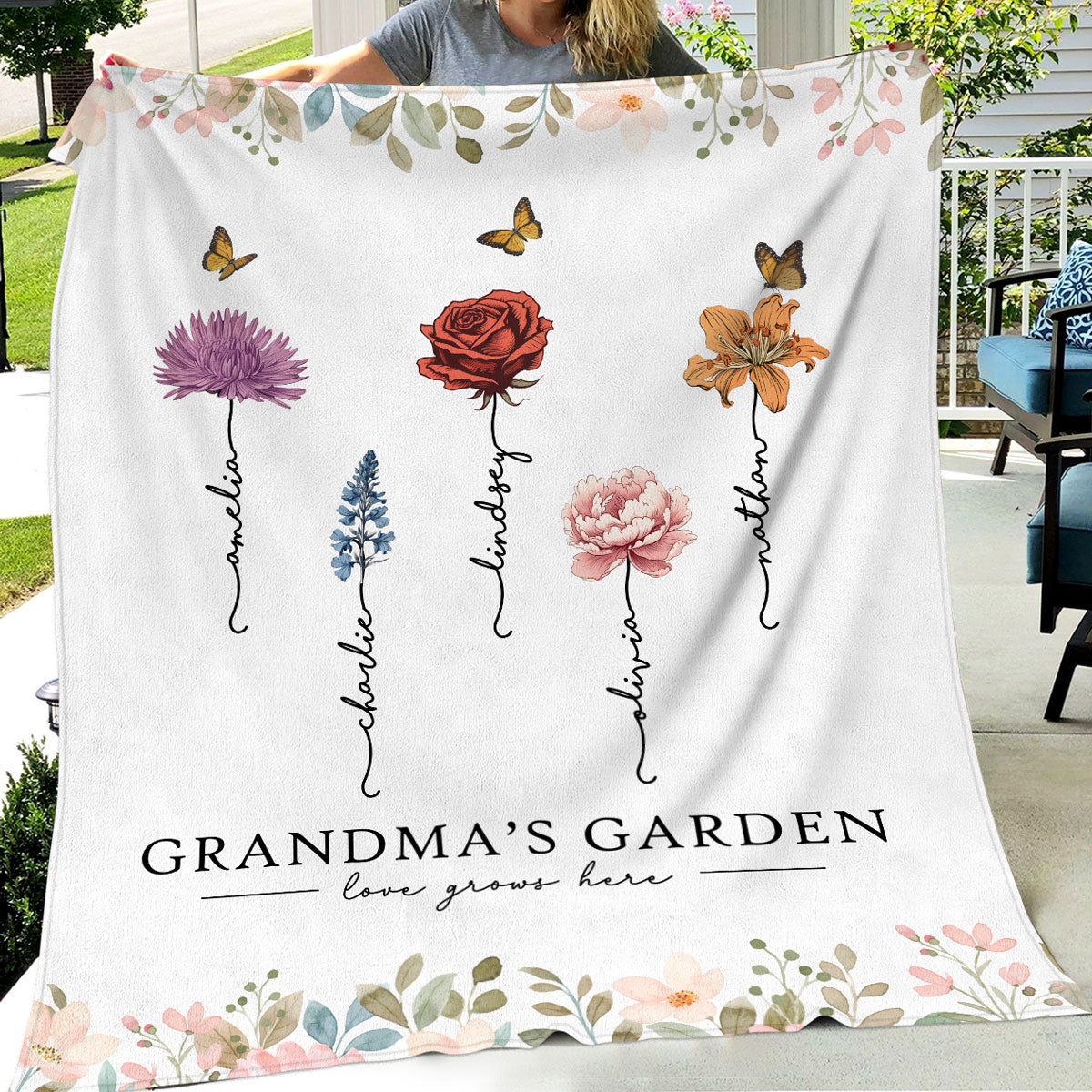 Grandma‘s Garden Love Grows Here Beautiful Birth Month Flower Gift For Grandma Mom Personalized Fleece Blanket