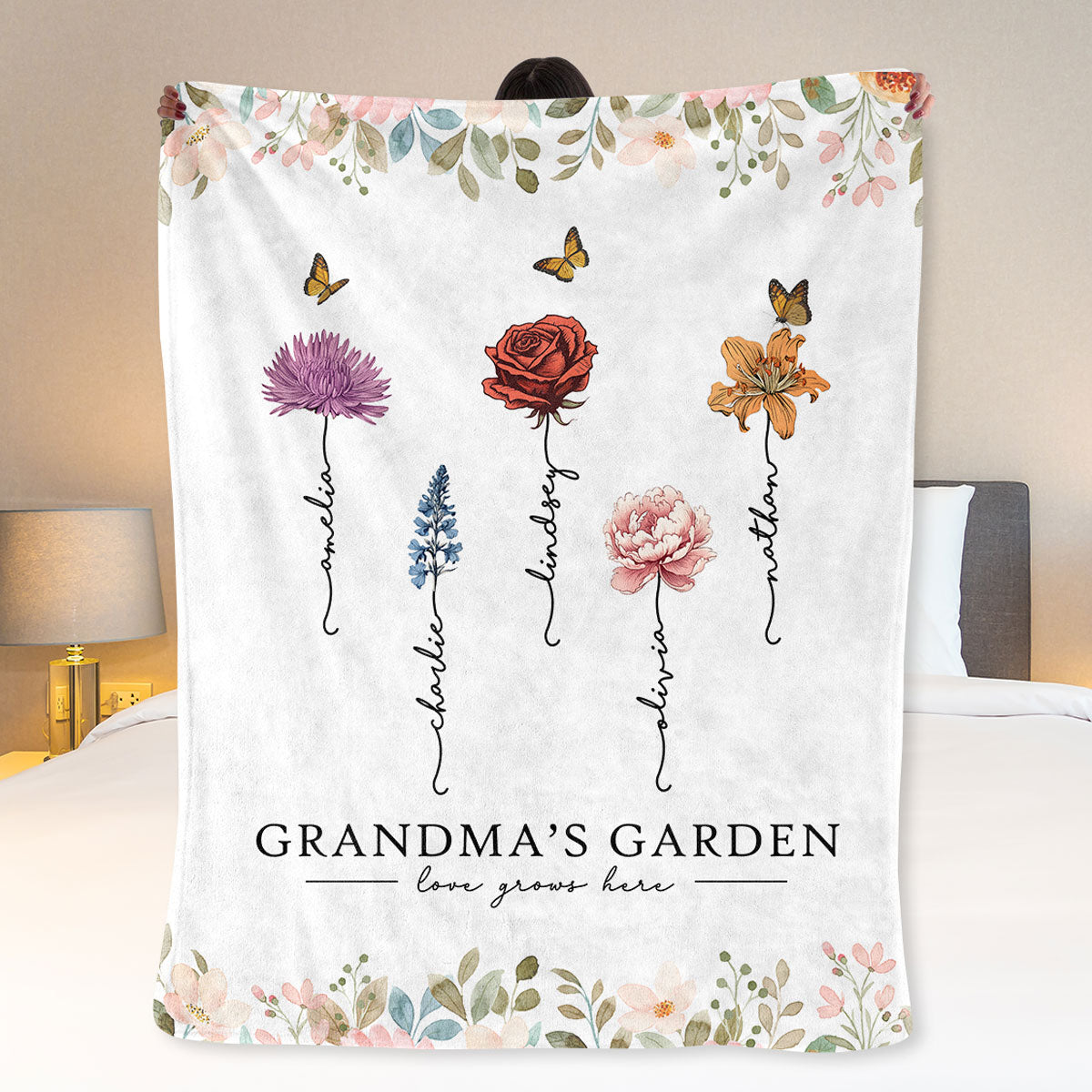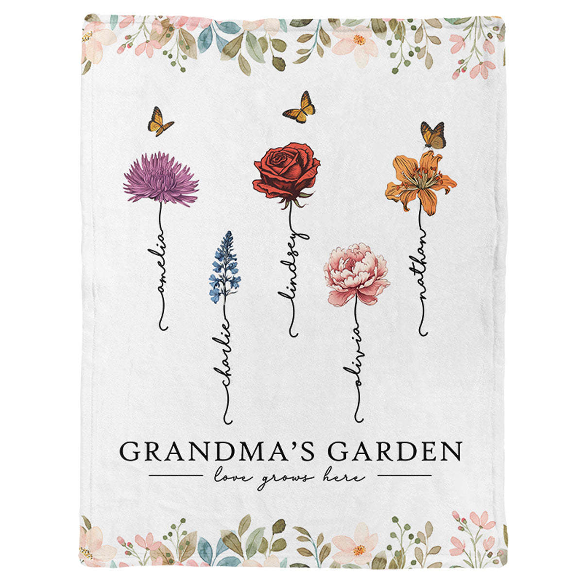 Grandma‘s Garden Love Grows Here Beautiful Birth Month Flower Gift For Grandma Mom Personalized Fleece Blanket