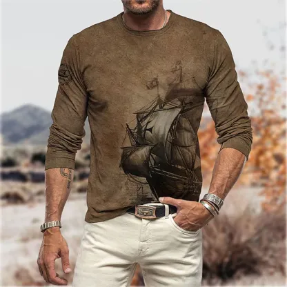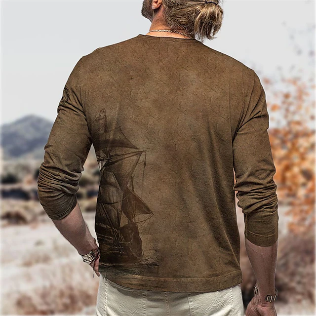 Men's T shirt Tee Graphic Prints Rudder Crew Neck Brown 3D Print Outdoor Street Long Sleeve Print Clothing Apparel Basic Vintage Sports Designer