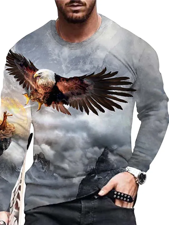 Men's Unisex T shirt Tee Graphic Prints Eagle Crew Neck Gray 3D Print Daily Holiday Long Sleeve Print Clothing Apparel Designer Casual Big and Tall