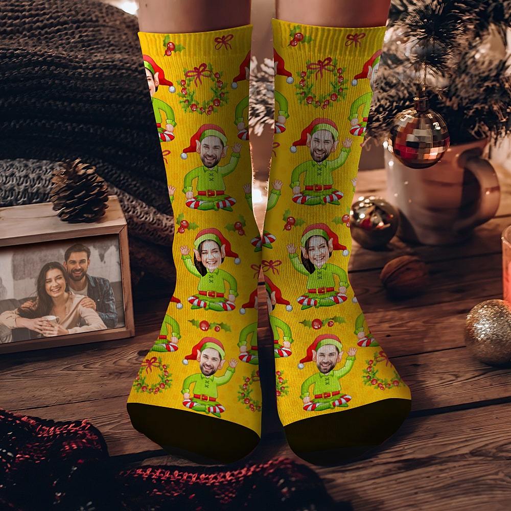 Custom Face Socks Personalized Christmas Elf Socks Christmas Gift for Sweetheart Yellow